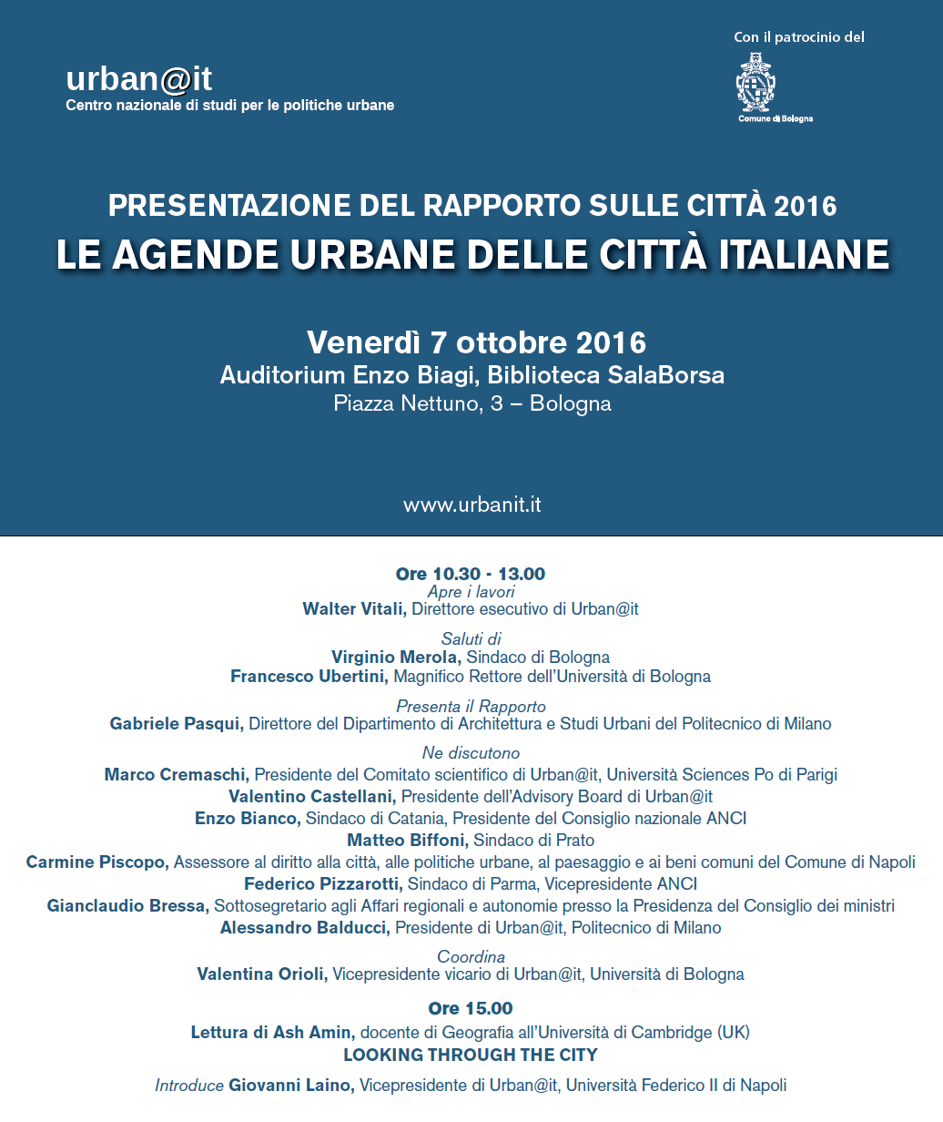 Venerdì 7 ottobre 2016 dalle ore 10.00 presso l'Auditorium Enzo Biagi di Salaborsa, il Centro Nazionale di Studi per le Politiche Urbane Urban@it presenta il suo secondo Rapporto annuale sulle città dedicato alle “Agende urbane delle città italiane”.