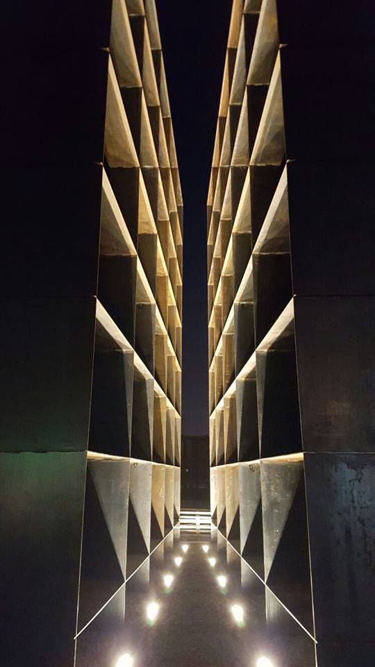 Ma esiste un’altra faccia del Memoriale: una facciata liscia – dove il perimetro delle celle si indovina solo attraverso lievi sporgenze – pensato espressamente per riflettere suoni, luci e immagini.